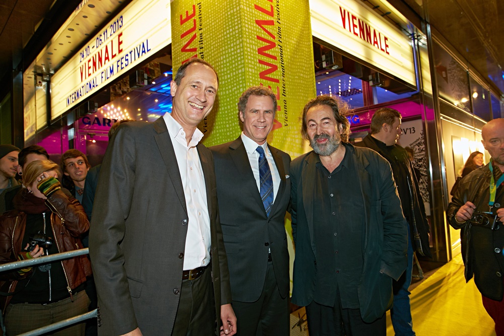 Vor dem Eingang zum Gartenbau wurde Will Ferrell vom Wiener Kulturstadtrat Andreas Mailath-Pokorny (li.) und von Viennale-Direktor Hans Hurch (re.) über den roten Teppich geleitet, der - farblich passend zum Festival-Plakat - allerdings ein grüner Teppich war.